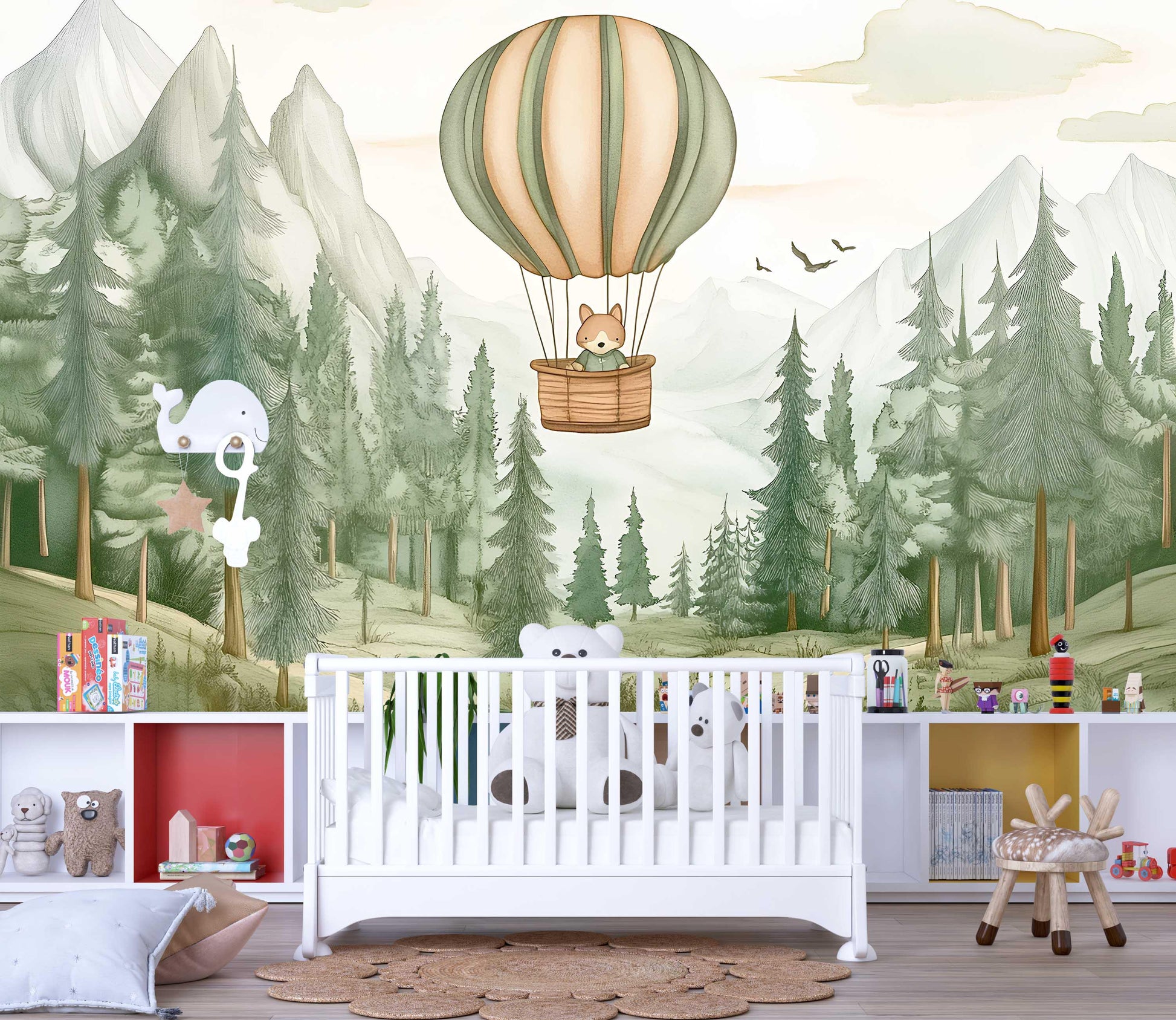 Transform your child's room into a magical woodland adventure with this whimsical forest wall mural. Featuring a soft, hand-painted style, this mural includes a serene mountain landscape, pine trees, and a sweet woodland animal riding in a hot air balloon. Perfect for nurseries, playrooms, or toddler bedrooms, this calming nature scene adds a cozy and imaginative atmosphere to any space.