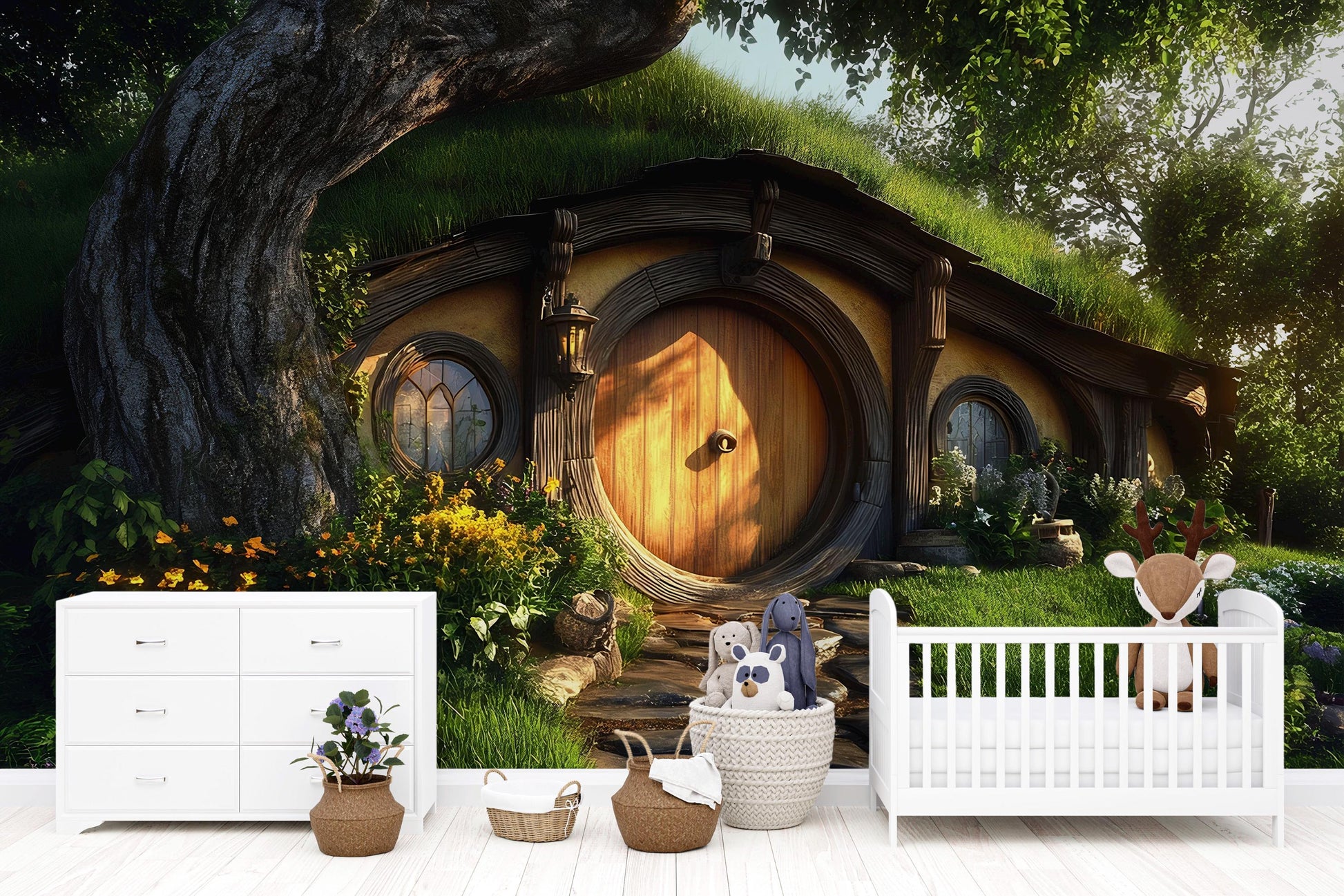 Transform your child’s room into a magical retreat with this whimsical Hobbit house wall mural. Inspired by fairytales and fantasy landscapes, this high-resolution mural adds warmth and wonder to any space. Ideal for nurseries, playrooms, or reading nooks, the lush greenery, circular door, and blooming flowers evoke a sense of enchantment and peace. Printed on premium wallpaper, it's easy to install and makes a bold, charming statement in any home.