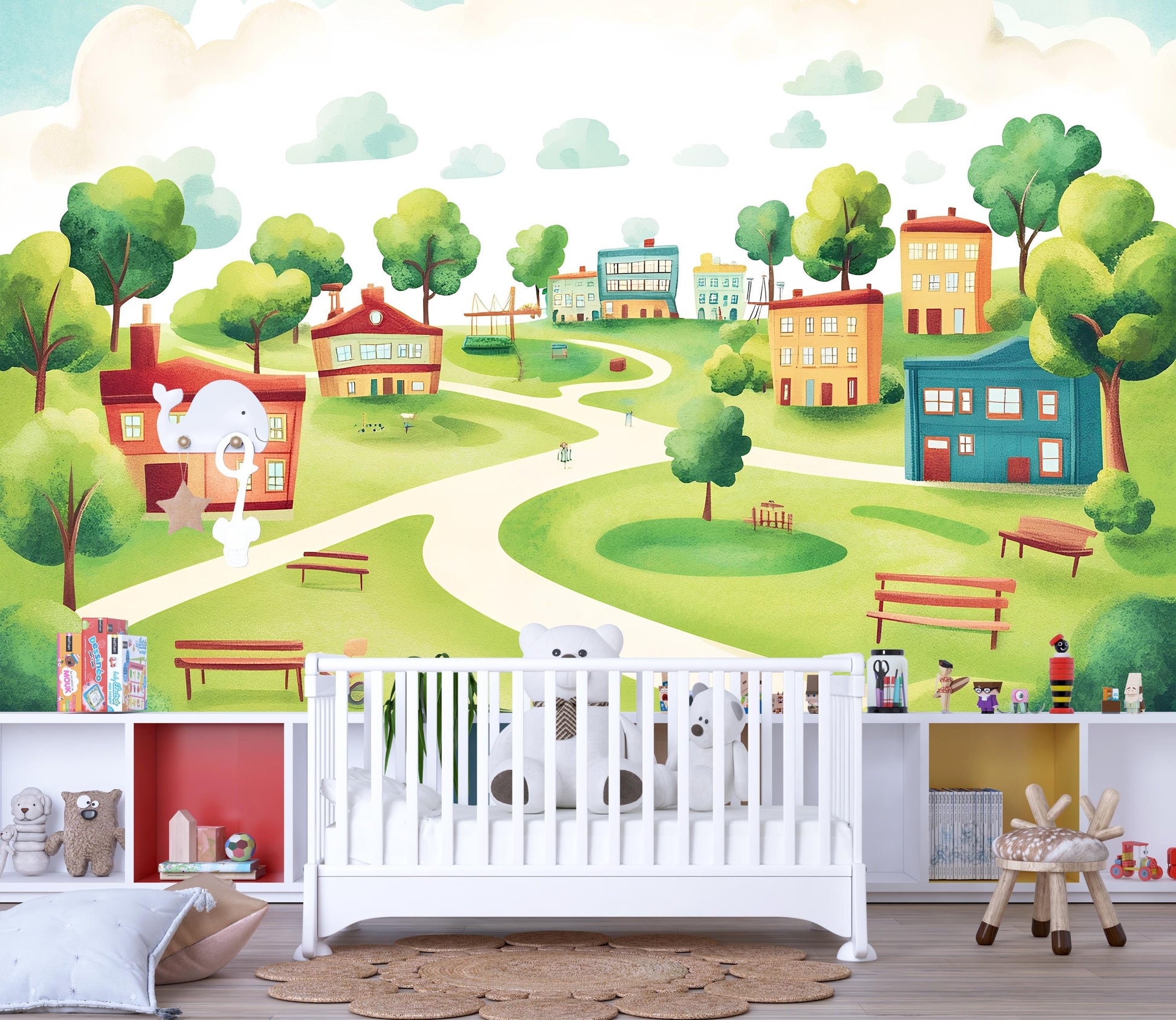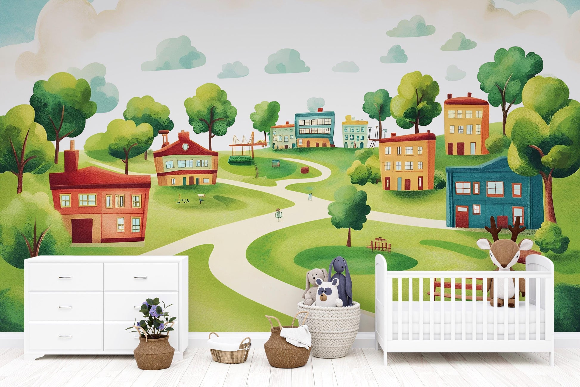 Whimsical Kids Wall Mural – Colorful Village Landscape Wallpaper for Nursery or Playroom – Peel and Stick Removable Mural