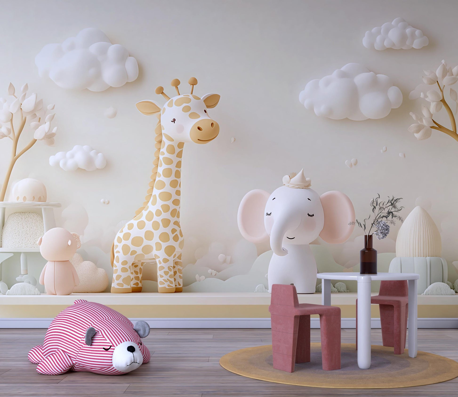 Features giraffe, elephant, clouds, and trees in soft pastels