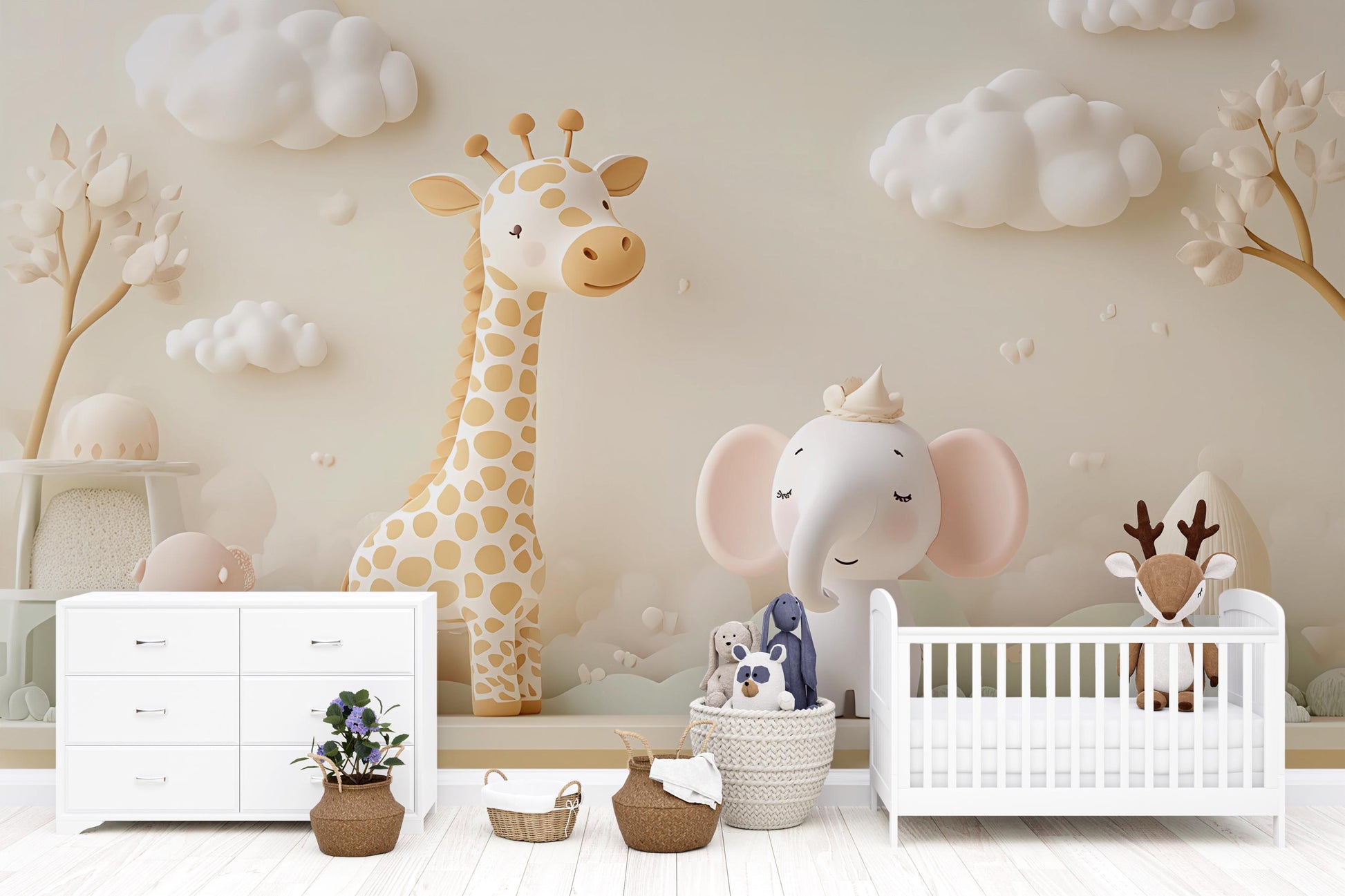 Transform your little one’s room with this adorable safari-themed wall mural featuring a smiling giraffe and a sweet elephant in a dreamy landscape. Perfect for nurseries, playrooms, and toddler bedrooms, this neutral-toned wallpaper design creates a calming and imaginative environment. Ideal for baby showers, new parents, or a stylish kids’ room makeover.