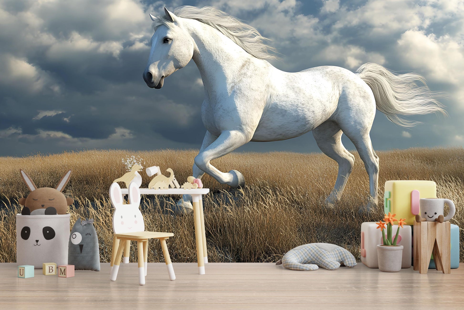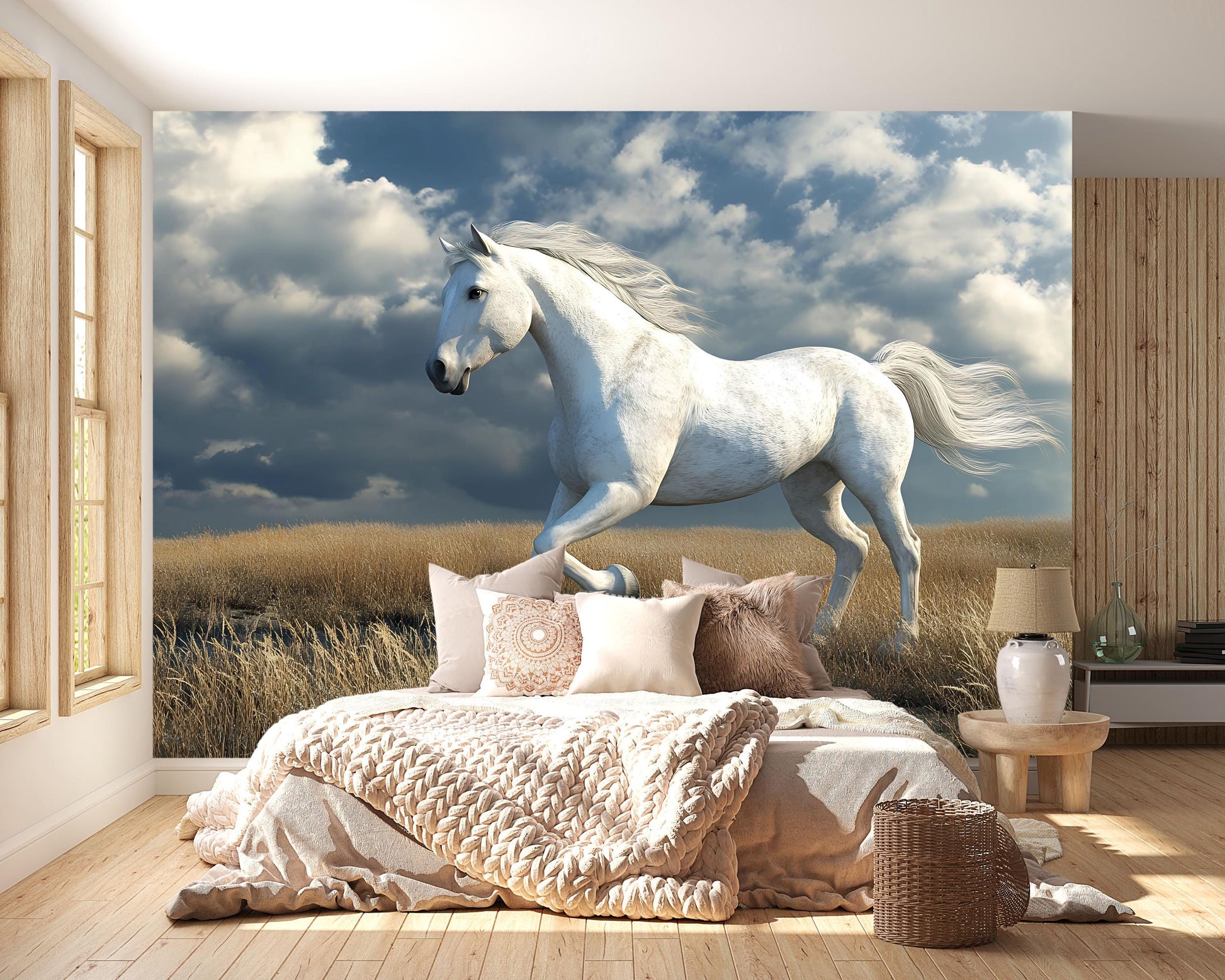 Add elegance and movement to your home with this beautiful white horse wall mural. Featuring a lifelike depiction of a majestic stallion galloping through a golden field under a dramatic cloudy sky, this high-resolution mural brings a sense of freedom and nature’s beauty to your space. Perfect for bedrooms, nurseries, living rooms, or equestrian-themed interiors, it makes an unforgettable statement wall. Available in peel-and-stick or traditional paste application, this mural is easy to install and remove, making it ideal for both renters and homeowners.