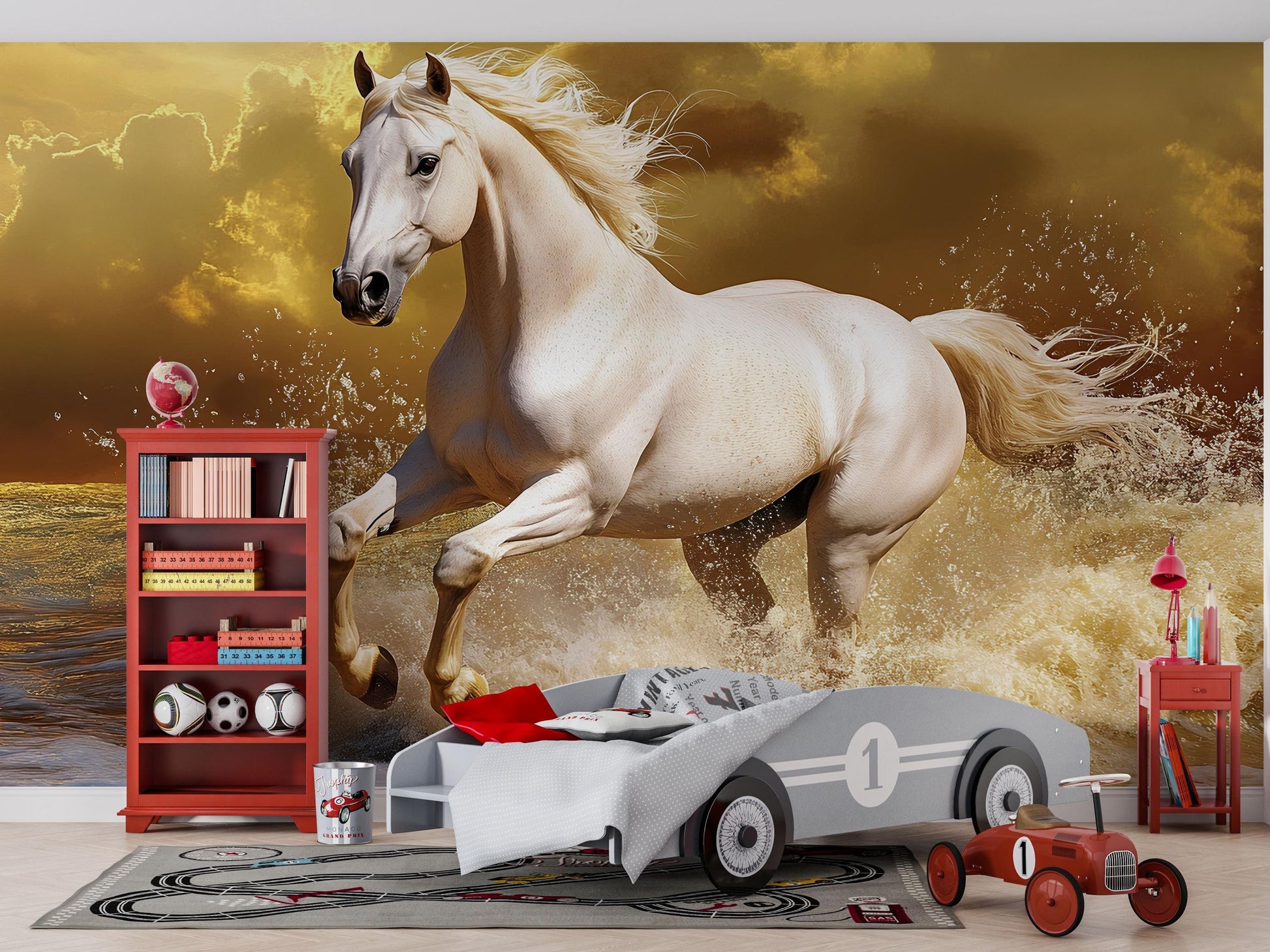 Capture the power and grace of nature with this stunning white stallion wall mural. Featuring a lifelike horse galloping through crashing ocean waves under a dramatic golden sky, this high-resolution design adds movement, energy, and elegance to any room. Perfect for kids’ rooms, game rooms, living spaces, or equestrian-themed interiors, it creates a bold statement wall that inspires adventure. Available in peel-and-stick or traditional paste application, this mural is easy to install and remove, ideal for renters and homeowners.