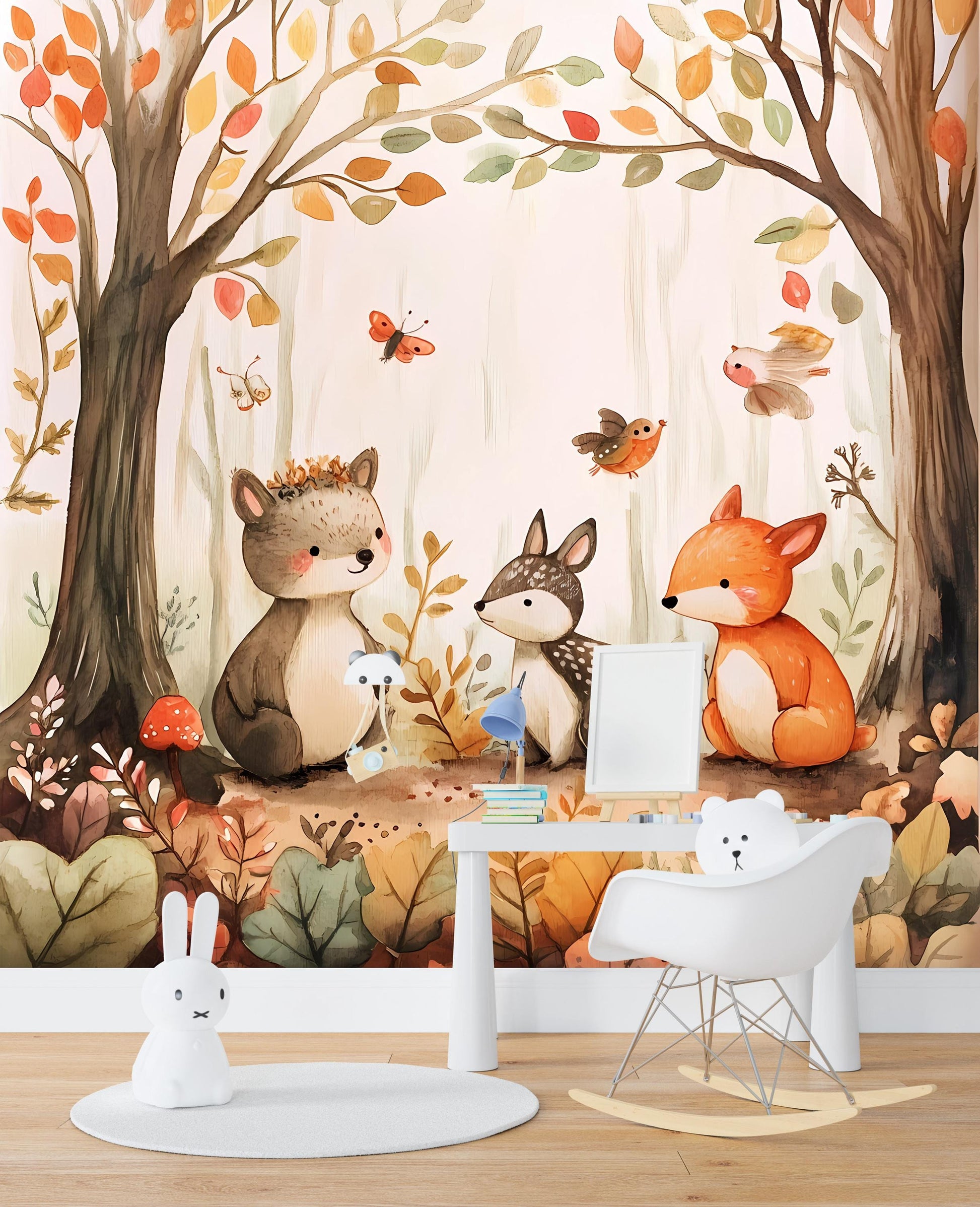 Transform your child's room into a magical forest with this adorable woodland animal nursery wall mural! Featuring a charming bear, deer, and fox surrounded by butterflies, birds, and trees in soft autumn tones, this mural brings warmth and whimsy to any space. Perfect for nurseries, playrooms, or toddler bedrooms, this high-quality wallpaper inspires imagination and a love for nature.