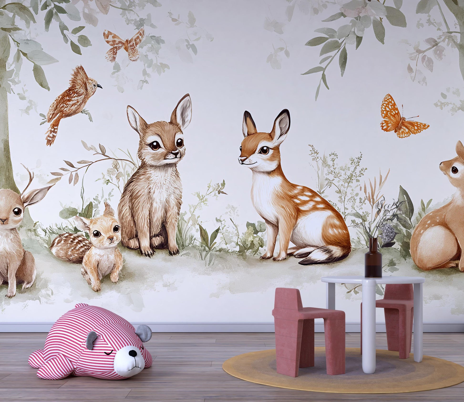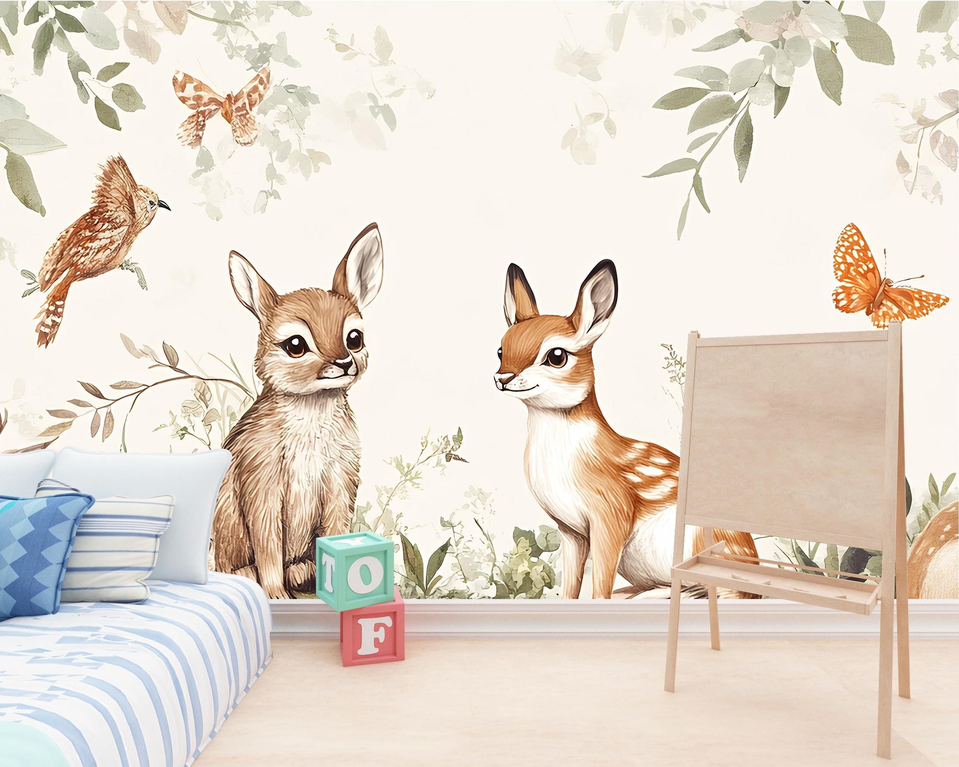 Transform your child's room into a whimsical woodland paradise with this adorable Woodland Animal Nursery Wall Mural. Featuring charming baby deer, bunnies, squirrels, birds, and butterflies in a forest setting, this peel-and-stick wallpaper is perfect for creating a cozy and magical atmosphere.