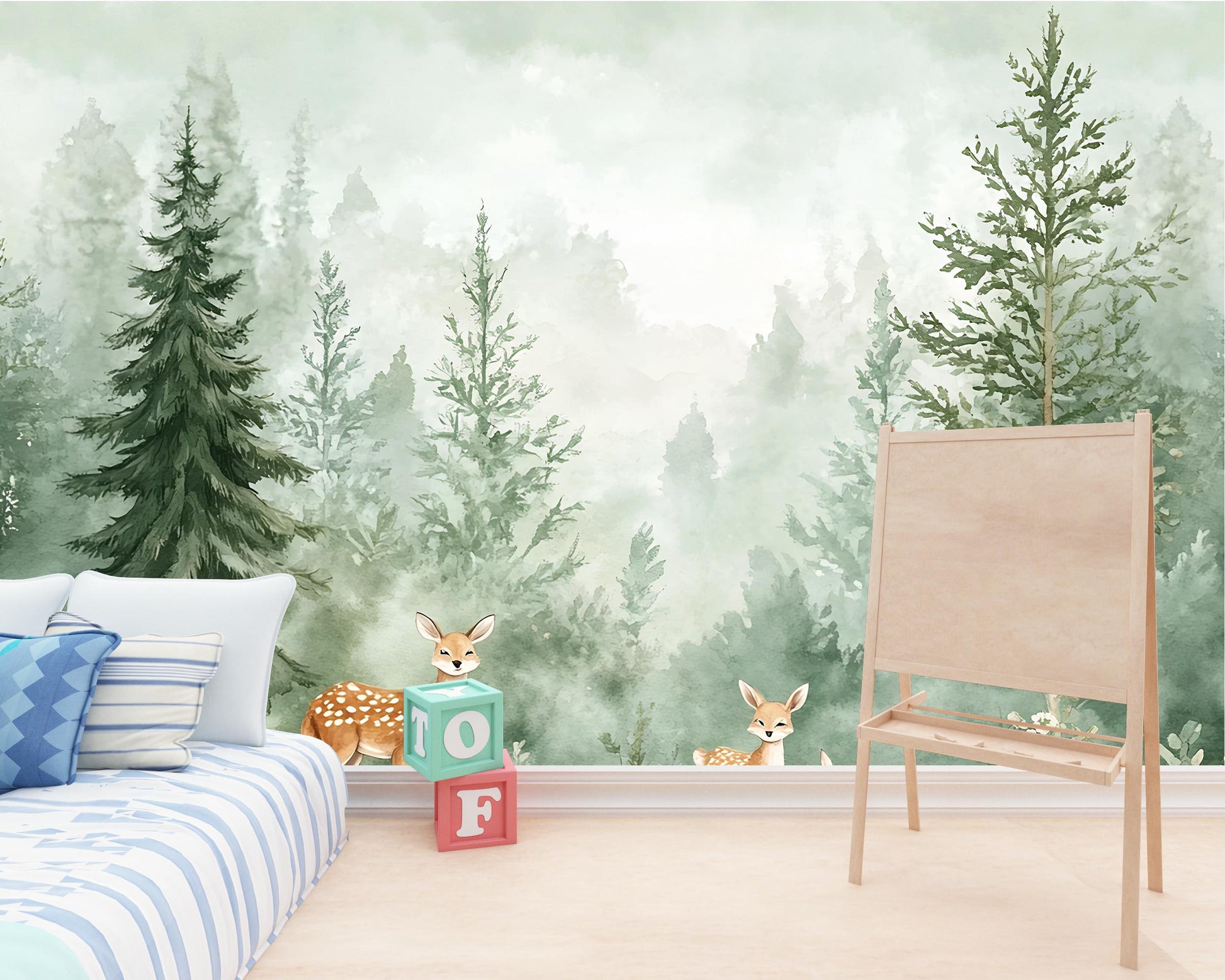 Transform your child's room into a magical forest with this stunning Woodland Deer Forest Wall Mural. Featuring charming baby deer, soft greenery, and a misty tree-filled background, this peel-and-stick wall art creates a peaceful, storybook setting perfect for nurseries, playrooms, or toddler bedrooms.