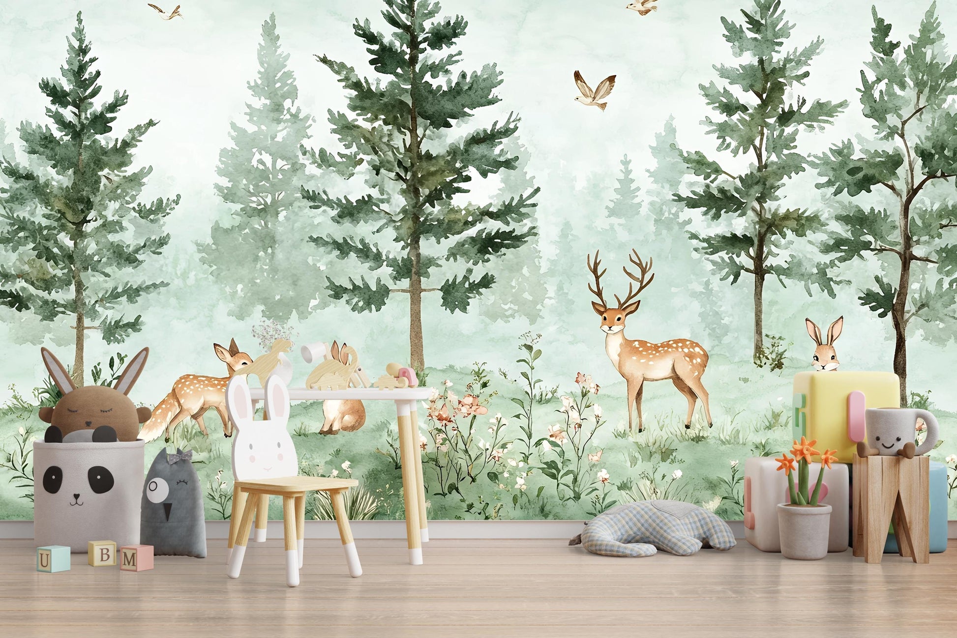 Transform your child's room into a serene woodland retreat with this beautiful Forest Animal Nursery Wallpaper. Featuring hand-painted deer, bunnies, trees, birds, and soft pastel greenery, this removable wall mural is perfect for nurseries, playrooms, or any kid's space.