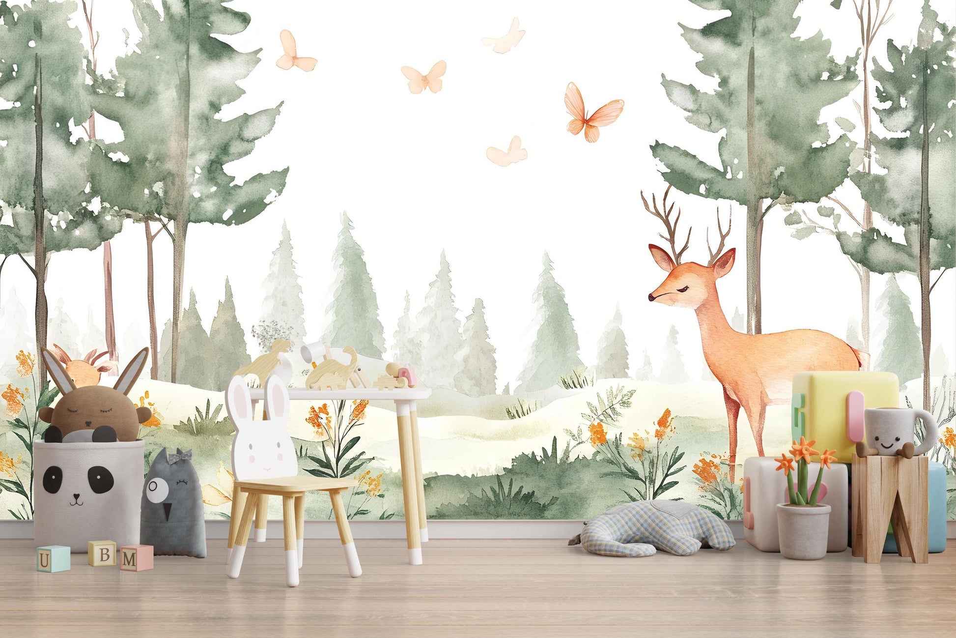 Woodland Forest Deer Wall Mural for Nursery – Cute Animal Wallpaper, Removable Peel and Stick Wall Decal Vn564