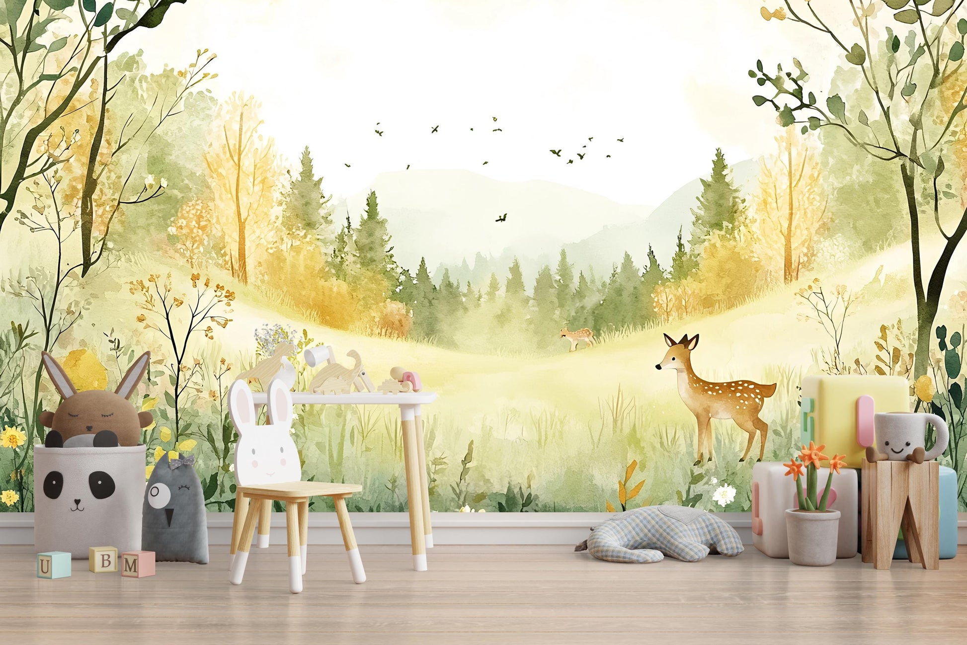 Woodland Forest Nursery Wall Mural – Nature Themed Wallpaper for Baby Room, Gender Neutral Scenic Wall Art Vn261
