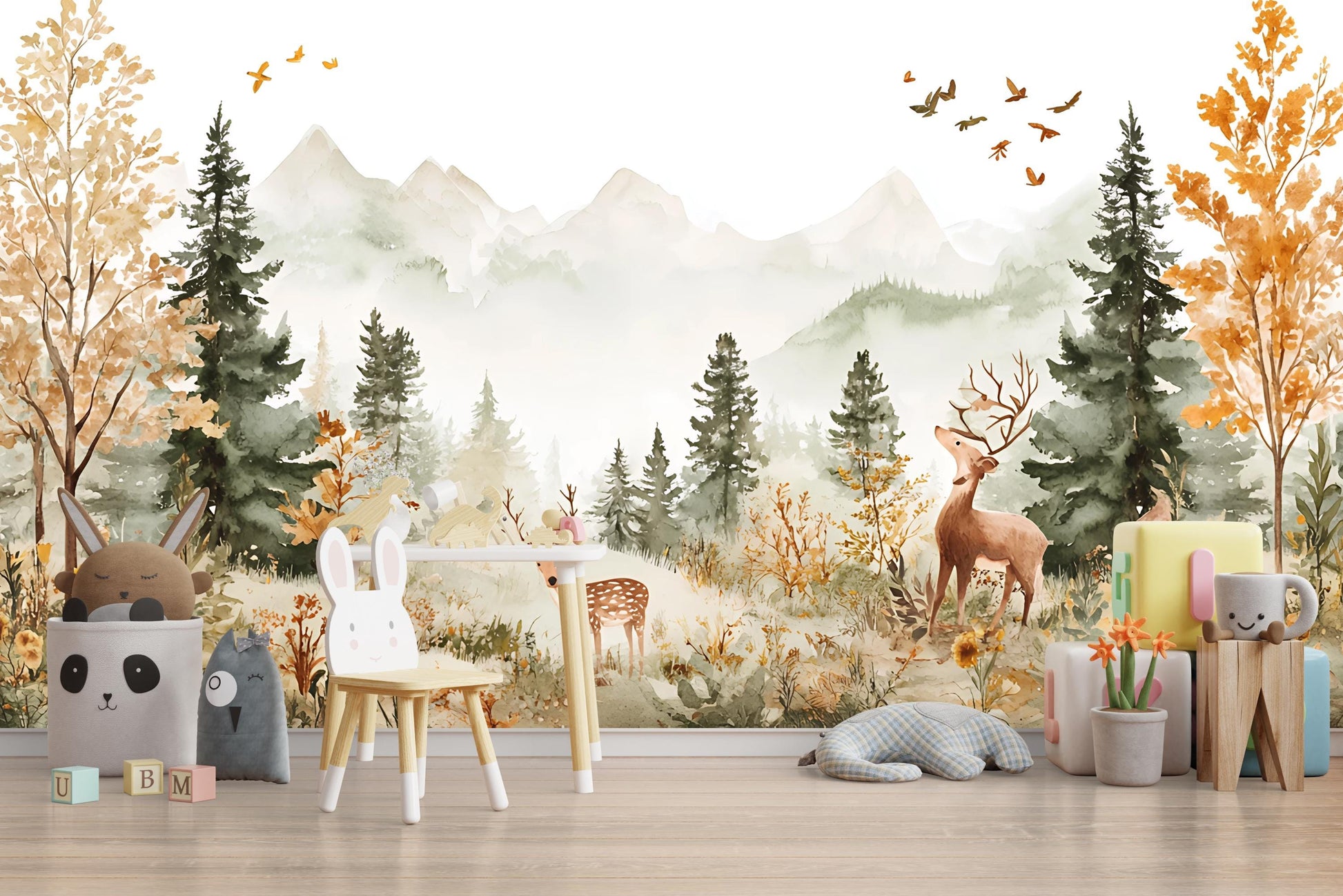 Woodland Forest Nursery Wallpaper Mural – Deer & Mountain Scene for Kids Room | Peel Stick or Traditional Wall ArtVn 294