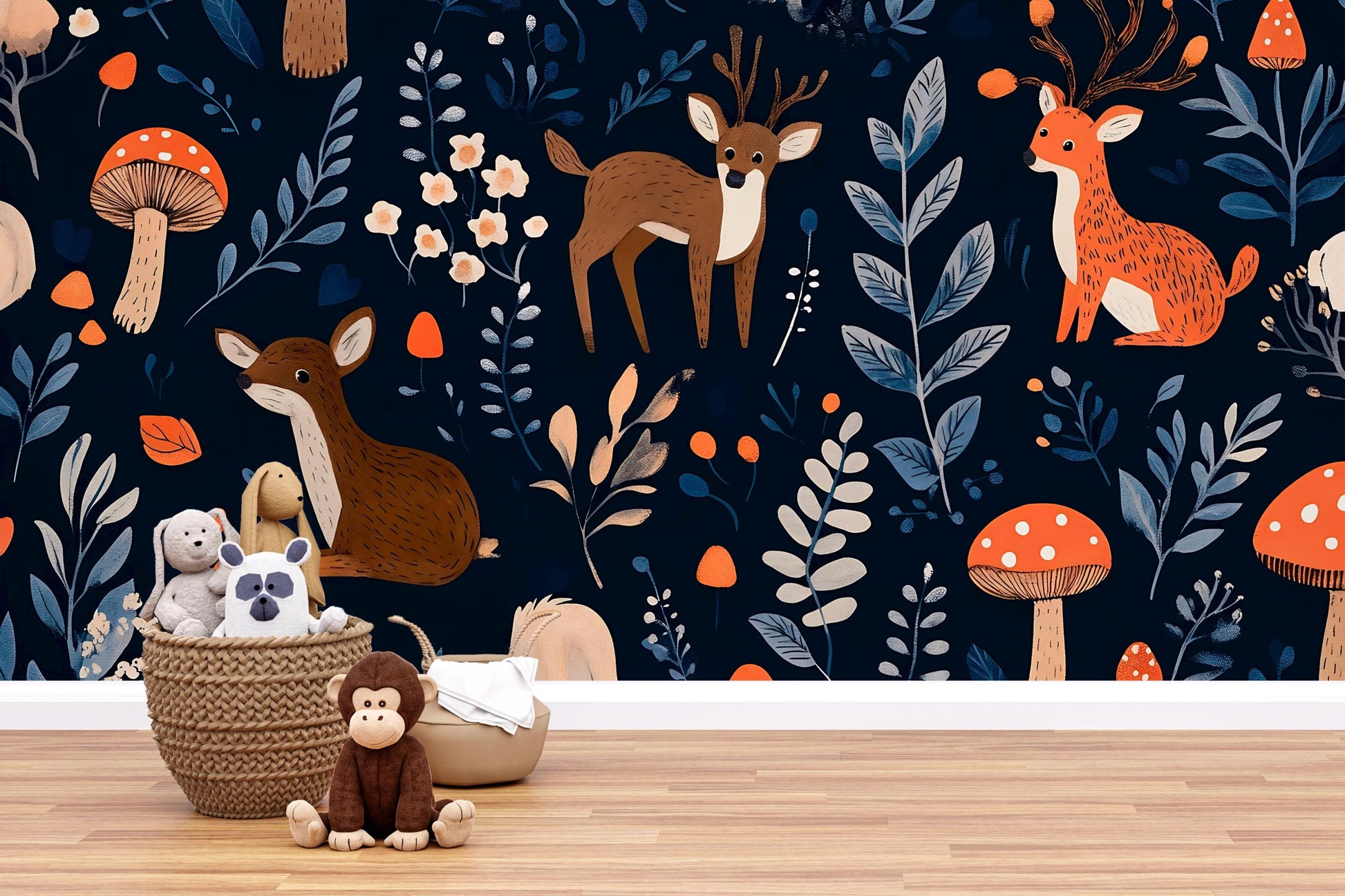 Transform your child's room into a magical woodland retreat with our adorable Woodland Nursery Wallpaper. Featuring hand-illustrated deer, mushrooms, flowers, and forest foliage in warm earthy tones and a deep navy background, this peel-and-stick wallpaper brings charm, calm, and creativity into any nursery, playroom, or kids' space.