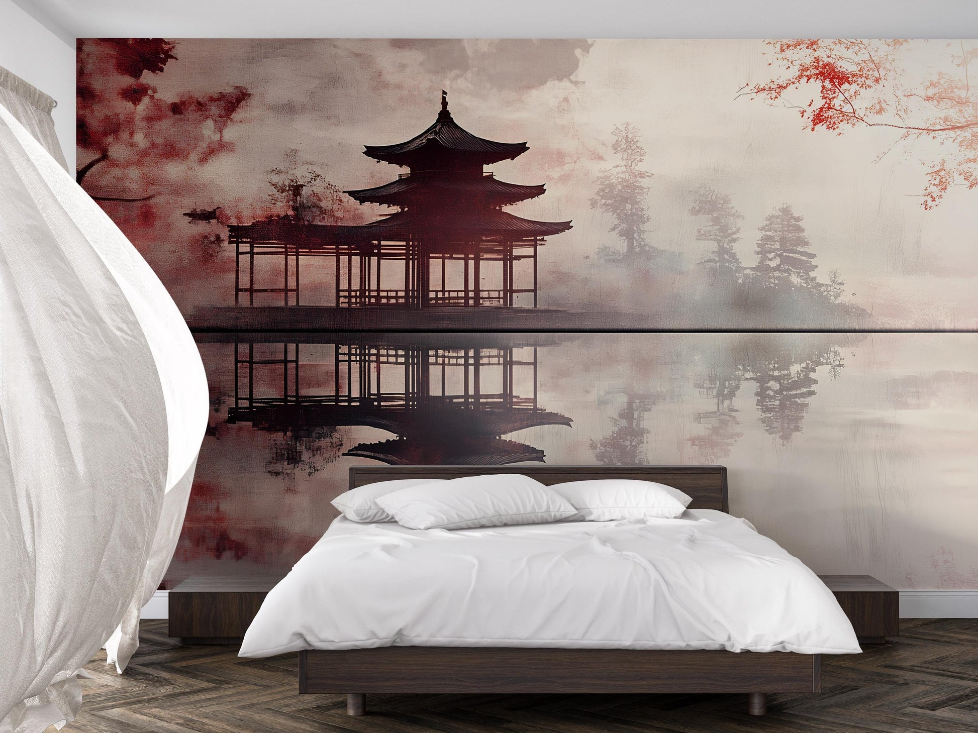 Transform your space into a serene retreat with this Zen Pagoda Wall Mural. Featuring a calming lakeside scene with a traditional Asian pagoda and mirrored reflections, this mural brings peace and elegance to any bedroom or meditation room. The blend of soft watercolor tones and misty trees creates a tranquil atmosphere perfect for relaxation.
